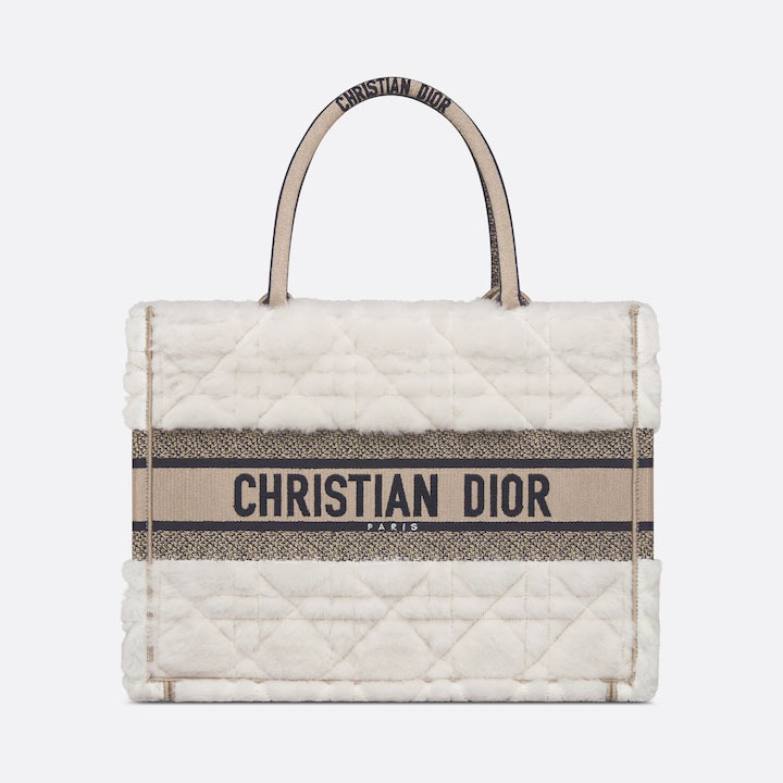 Introduced by Maria Grazia Chiuri, Creative Director of Christian , the Book Tote has become a staple of the aesthetic. Designed to hold all the daily essentials, the style is crafted in ice shearling and reveals the Cannage motif. Adorned with the Christian Paris signature on the front, the medium tote exemplifies the House's signature savoir-faire and may be carried by hand or worn over the shoulder.