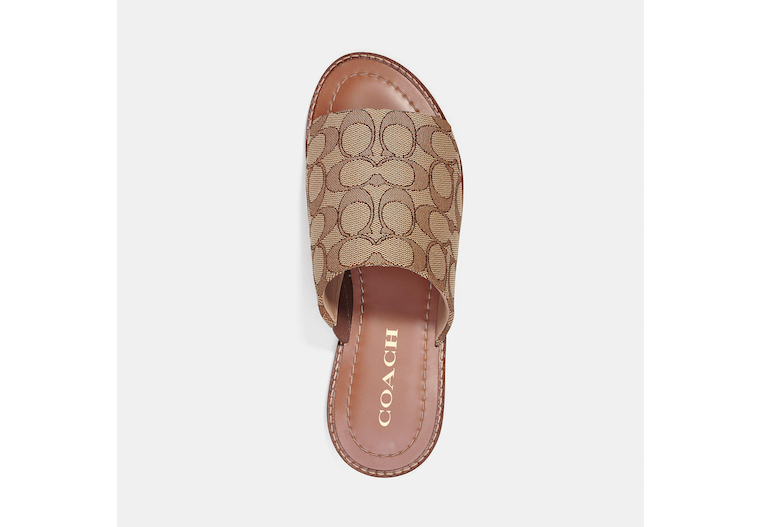 Signature jacquard and leather upper Man-made leather lining and footbed Rubber outsole Slip on This piece is crafted of our Signature jacquard made from a blend of organic cotton and recycled polyester Style No. CI054 | Outlet Hazel Sandal In Signature Jacquard - Beige, Size - 5.5