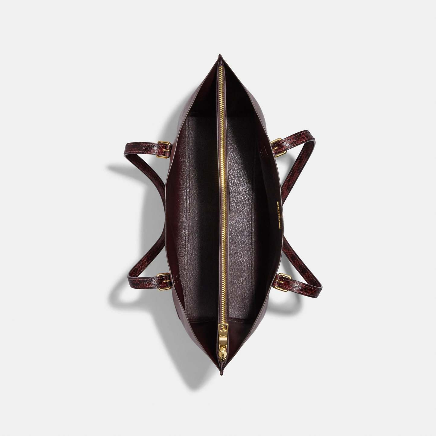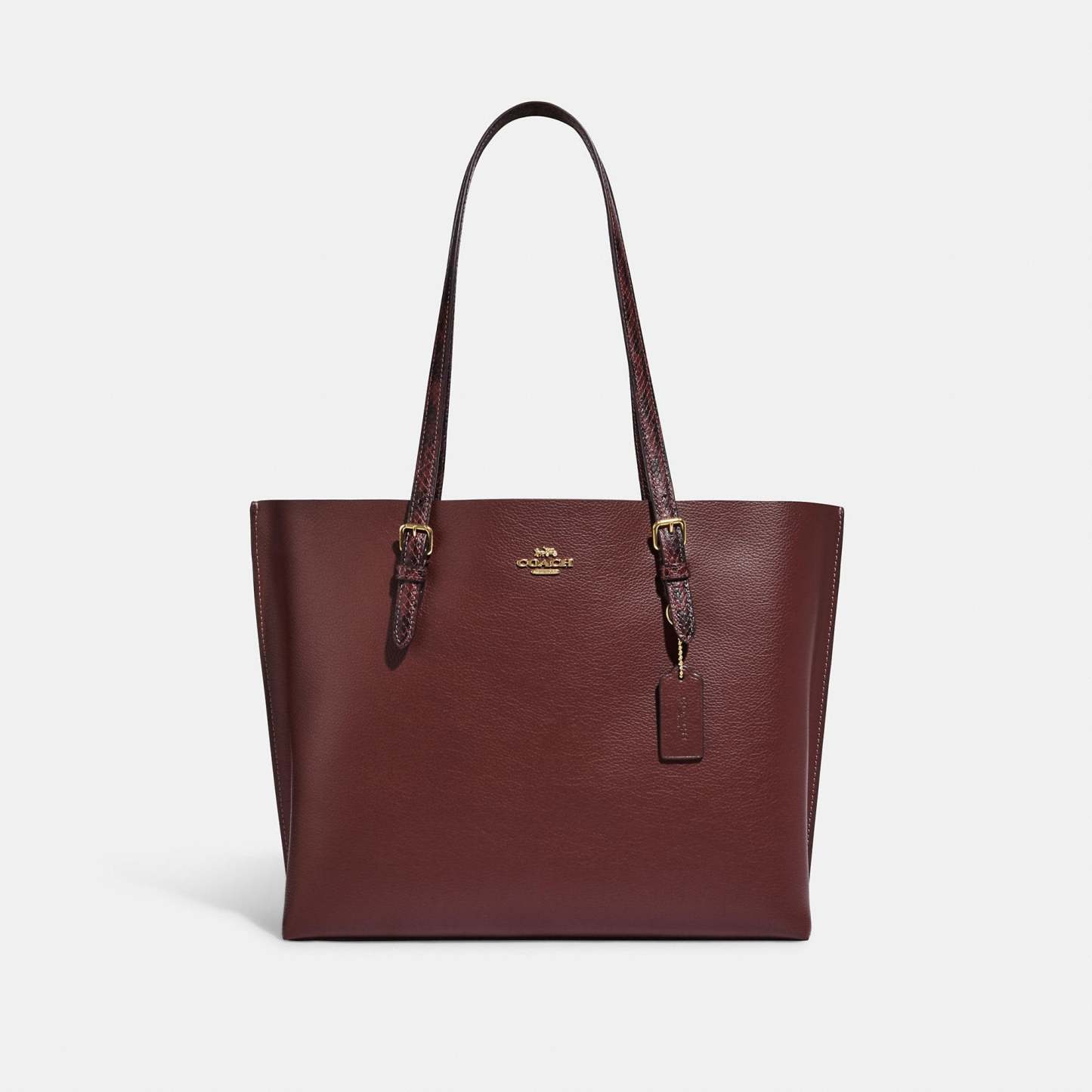 Double face leather and snake-embossed leather Inside multifunction pocket Zip-top closure fabric lining Handles with 10 1/4 drop Side open compartments 13 1/4 (L) x 11 (H) x 5 (W) Style No. CC750 | Outlet Mollie Tote - Red