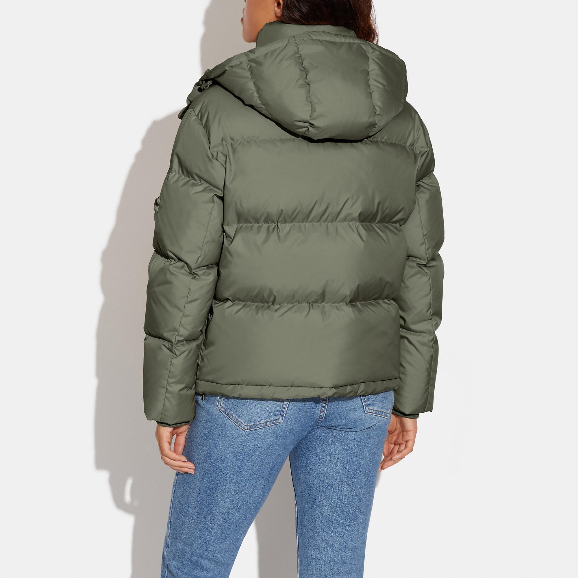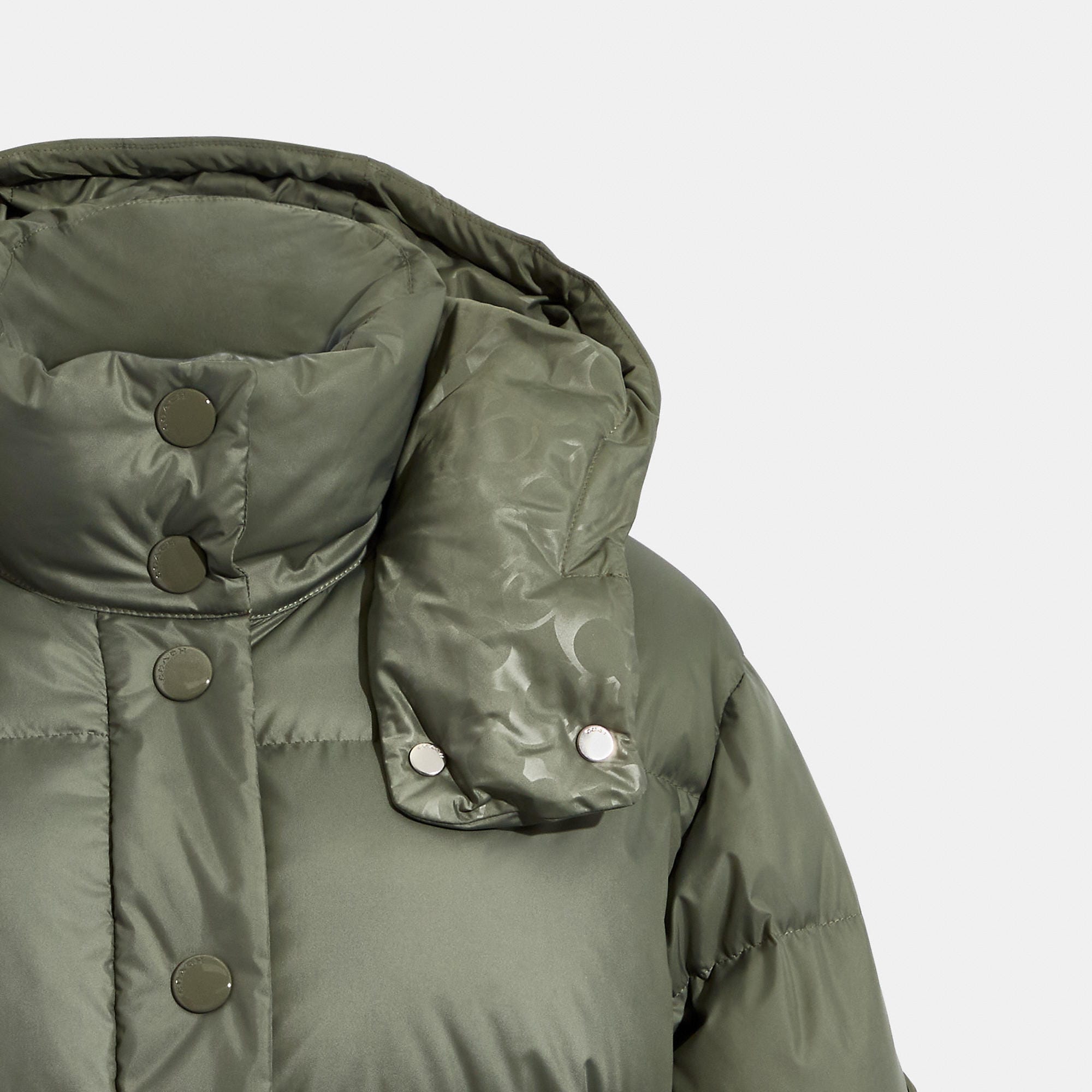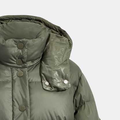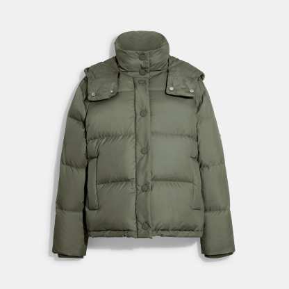 100% polyester Knit rib - 68% polyester 30% polyamide 2% elastane Lining - 100% polyester Fill - 90% down 10% feathers Snap button and zip closures Slip pockets Length - 25 1/4 Style No. CB633 | Outlet Short Down Puffer - Green, Size - Large