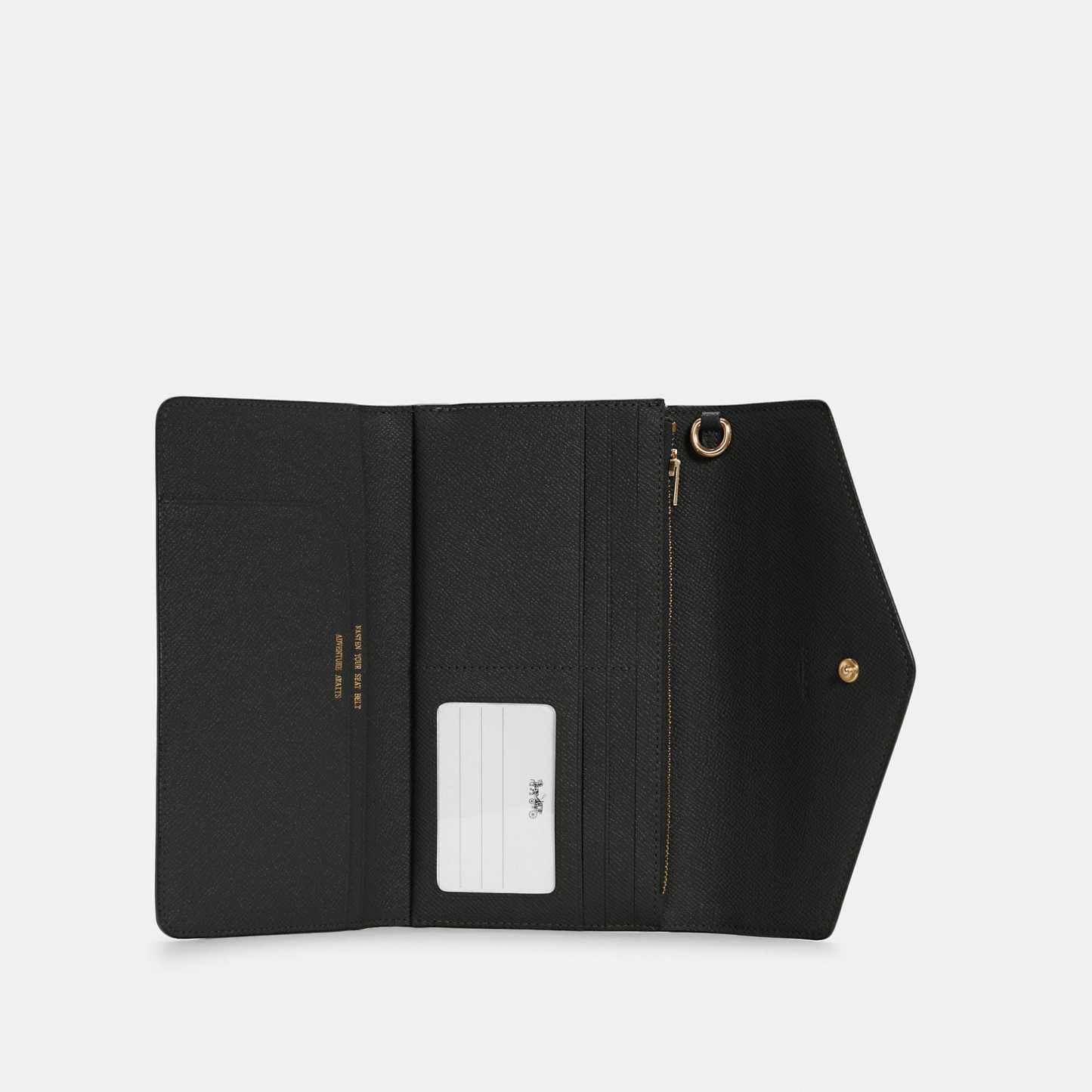 Crossgrain leather Five credit card slots ID window Inside zip and open pockets Snap closure Outside zip coin pocket Detachable wrist strap 8 1/4 (L) x 4 1/2 (H) Style No. C0707 | Outlet Travel Envelope Wallet - Black