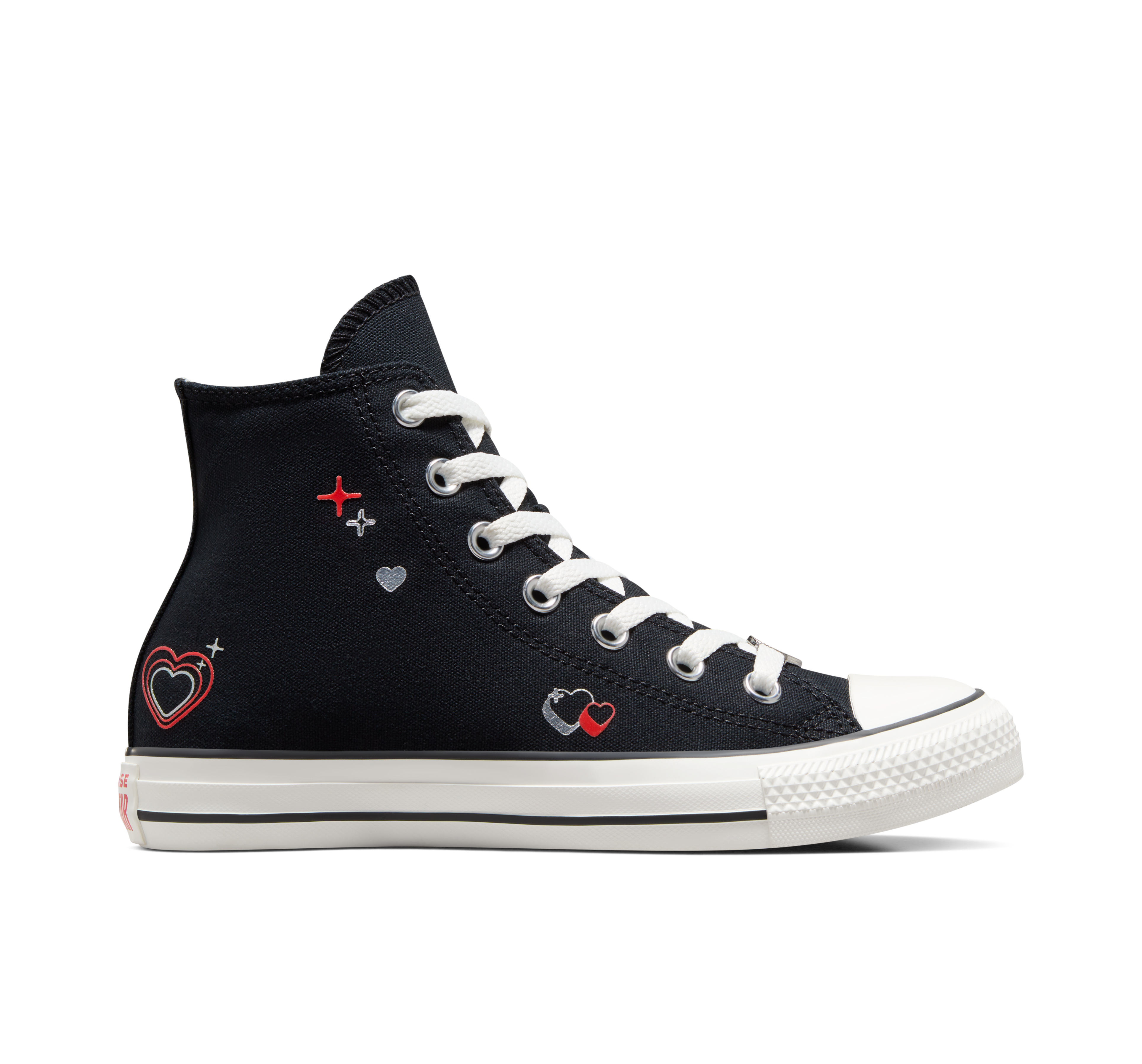 - Canvas upper with silicone hearts and silver metallic ink print