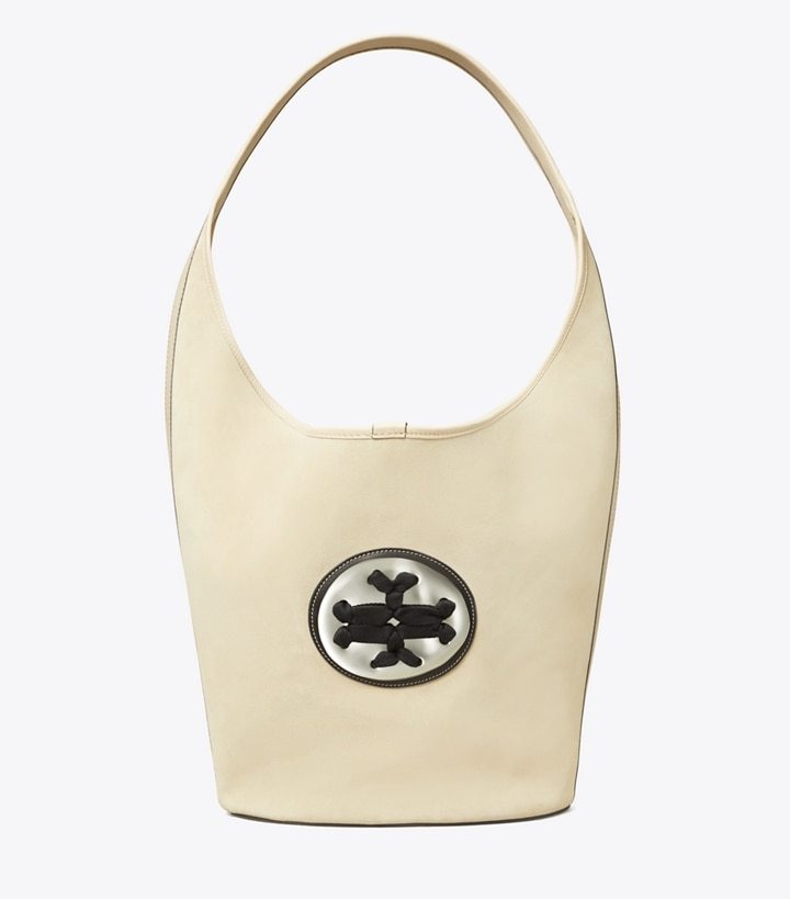 The new oversized bucket bag is crafted in soft suede with our new woven logo