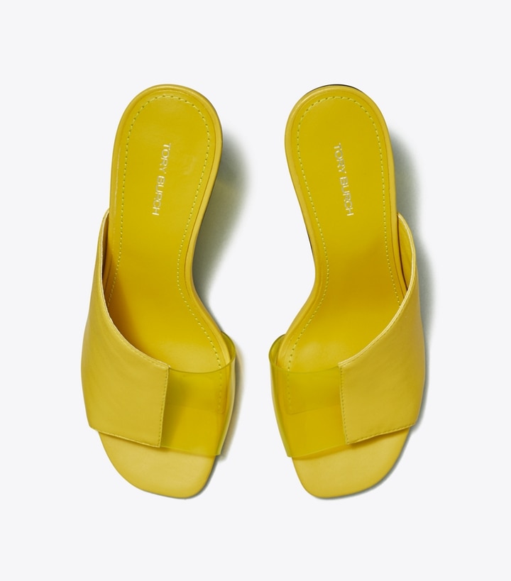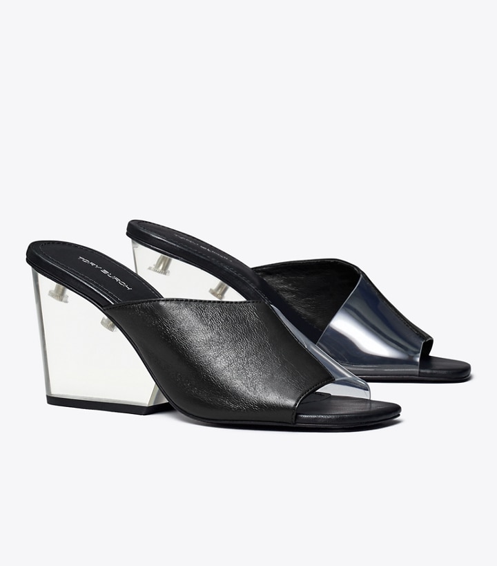 Expressive detail and an artful mix of materials define the new collection. Combining an asymmetrical strap with a lucite wedge heel, this mule sandal grounds casual day looks and festive party ensembles.